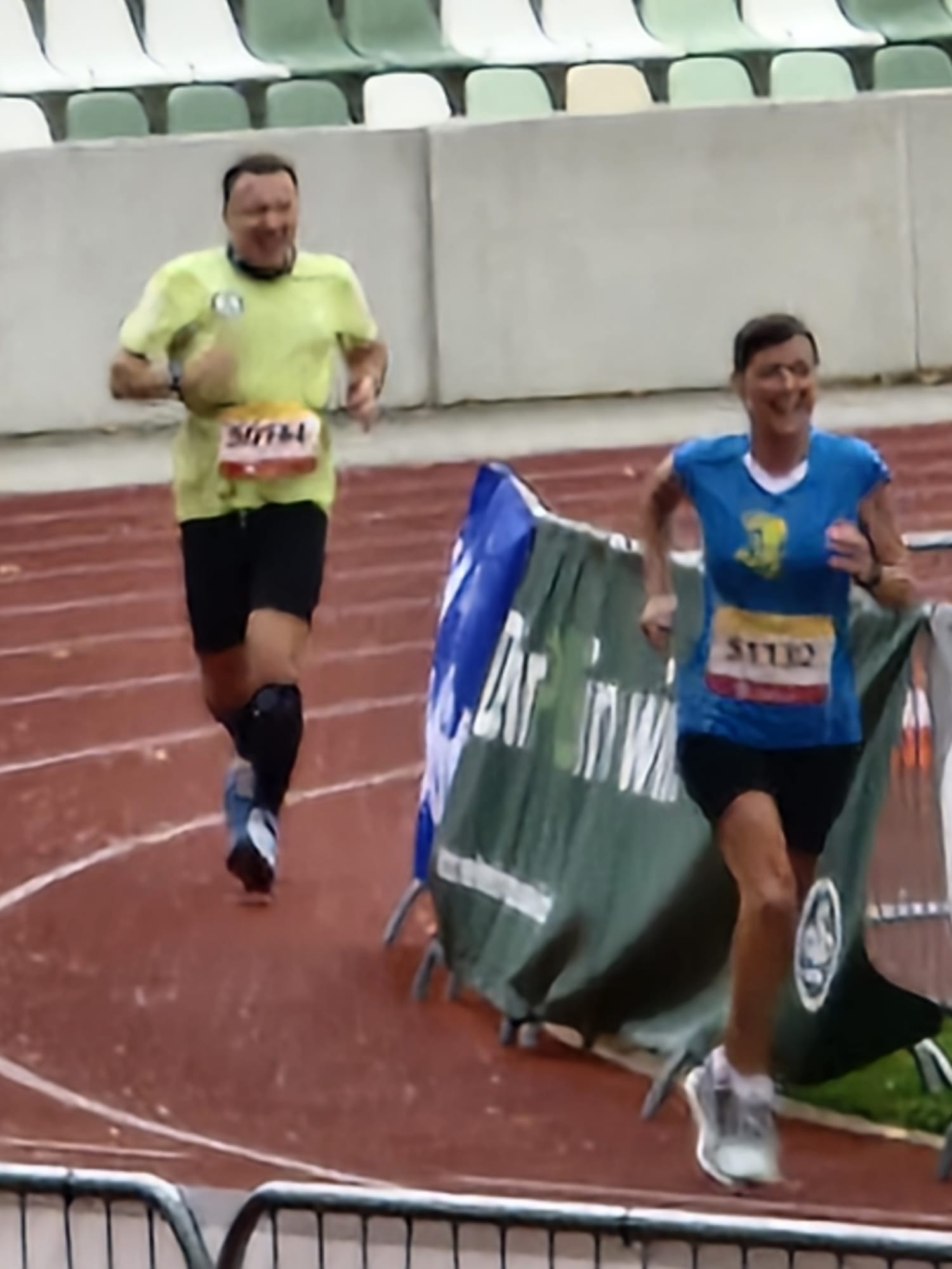 Im Regen kamen Uta und ich ins sehr schoene Stadion und genossen den Jubel der vielleicht 1000 Zuschauer. Der Wind war schon heftig und verhinderte eine schnellere Zeit. Den letzten Kilometer bin ich in 4.14 Minuten gelaufen. Die letzten 200 Meter sogar in 40 Sekunden.