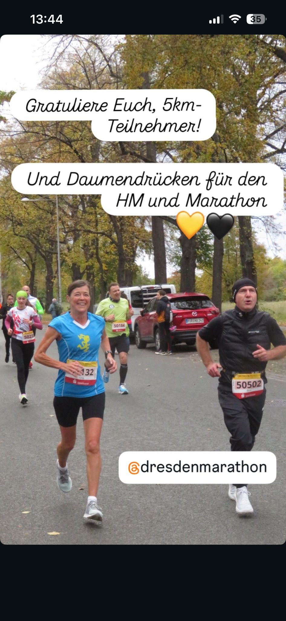 In diesem Jahr laufe ich die 5 km in Dresden. Aus unserem Verein werden Andre‘ Göhler und Stefan Alberti im Halbmarathon am Start sein. Durch schwere Krankheit ist leider Michael nicht am Start und auch Clarissa wird nicht über die Marathondistanz trotz Meldung starten.