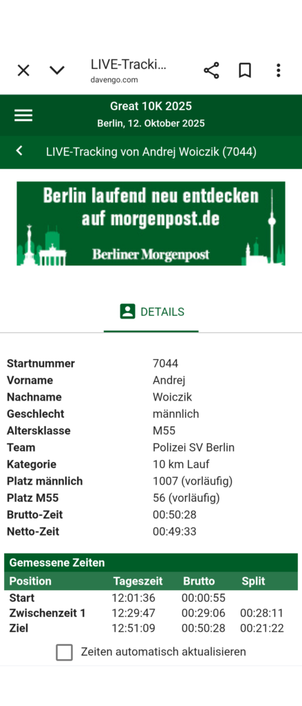 Wenn ich mich in den kommenden Tagen besser fühlen sollte, dann ist eine Zeit von 47:59-48:59 Minuten realistisch. Natürlich würde ich lieber eine schnellere Zeit laufen, aber das lassen das absolvierte Training und mein Körper nicht zu. Durch Yoga & Kräftigung will ich die kommenden Monate versuchen mich in meinem Alter in Form zu bringen und die körperlichen „Gebrächen“ in den Griff zu bekommen.