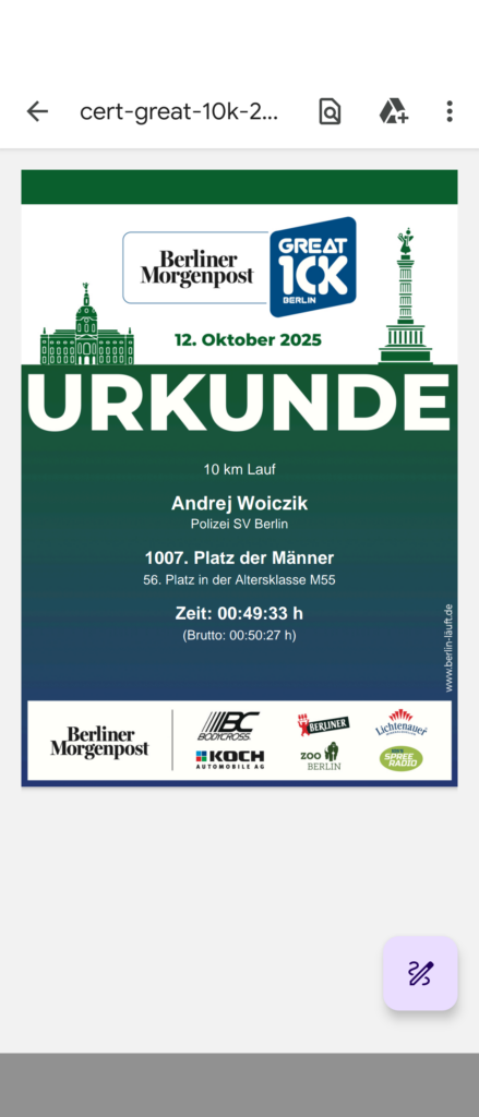Ich hoffe, dass sich Frank nach seinem Debütlauf gut erholt und weiter über die Berliner Straßen flitzen wird. Winfried untermauerte erneut seine Vormachtstellung in der M55 in Berlin und unsere Mitglieder unserer PSV-Laufgruppe waren gut in Schuss. Tags zuvor erreichten Stefan Alberti, Christoph und Willi bei den Landes-Crossmeisterschaften in Henningsdorf Podiumsplätze.