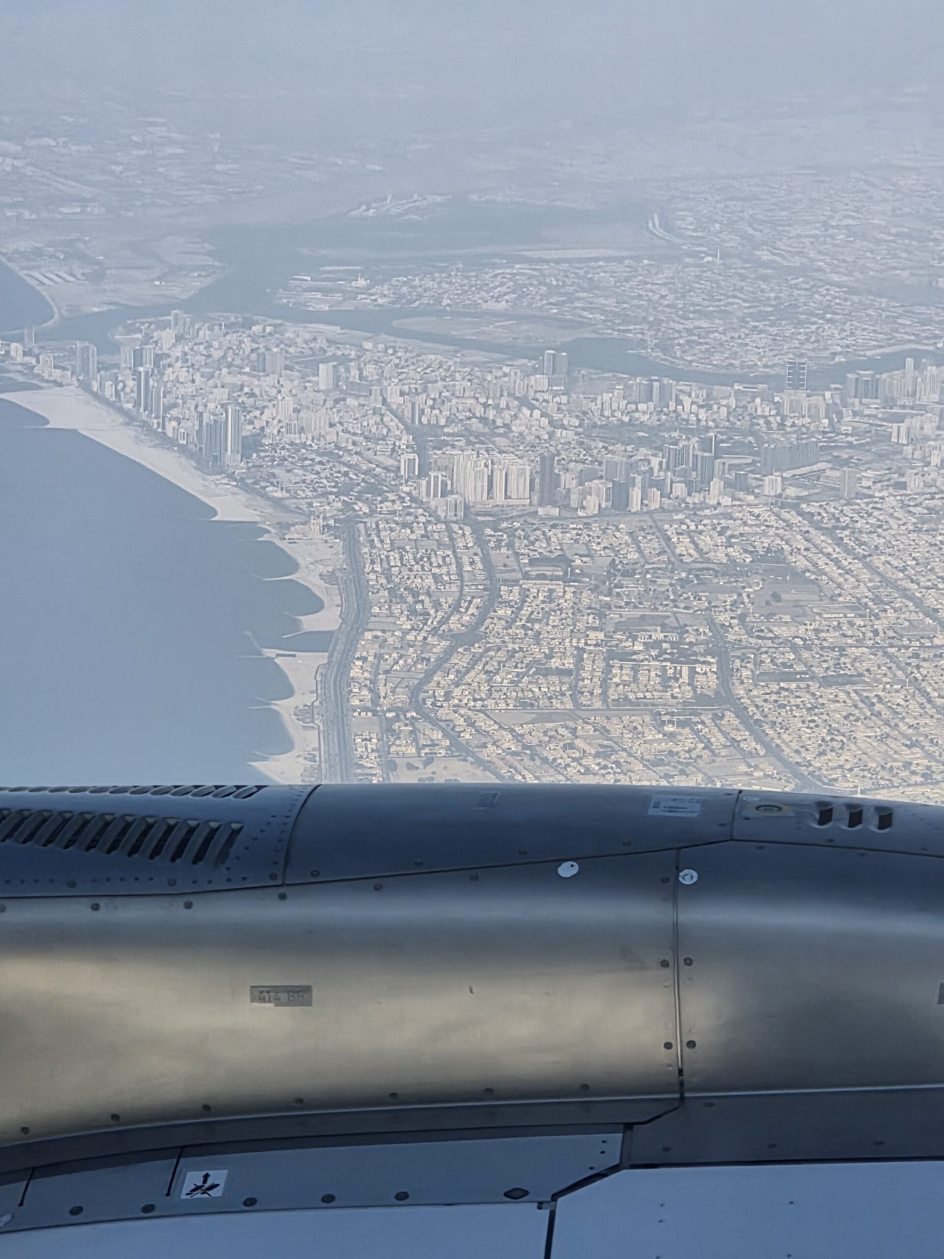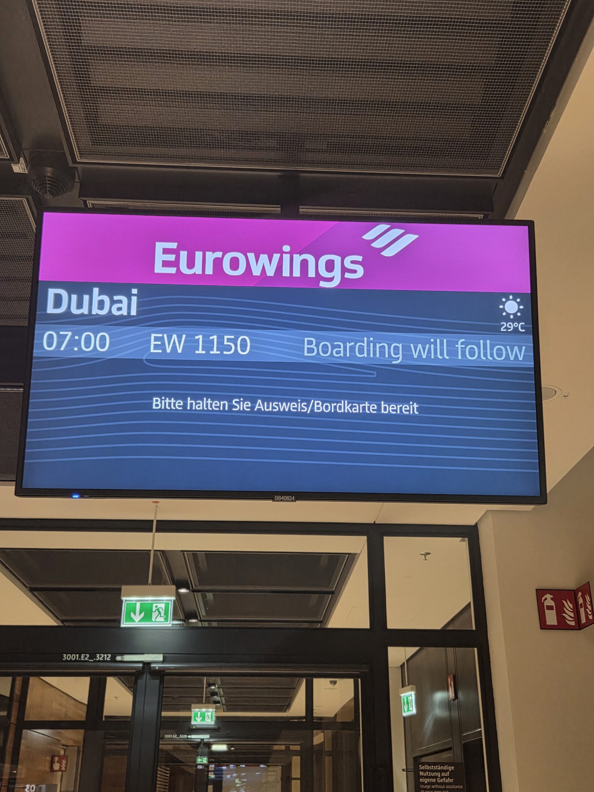 Wir haben in Reihe 9 A und 9 B gesessen und freuten uns, dass ohne Verspatung der EW 1150 Richtung Dubai abgehoben ist.